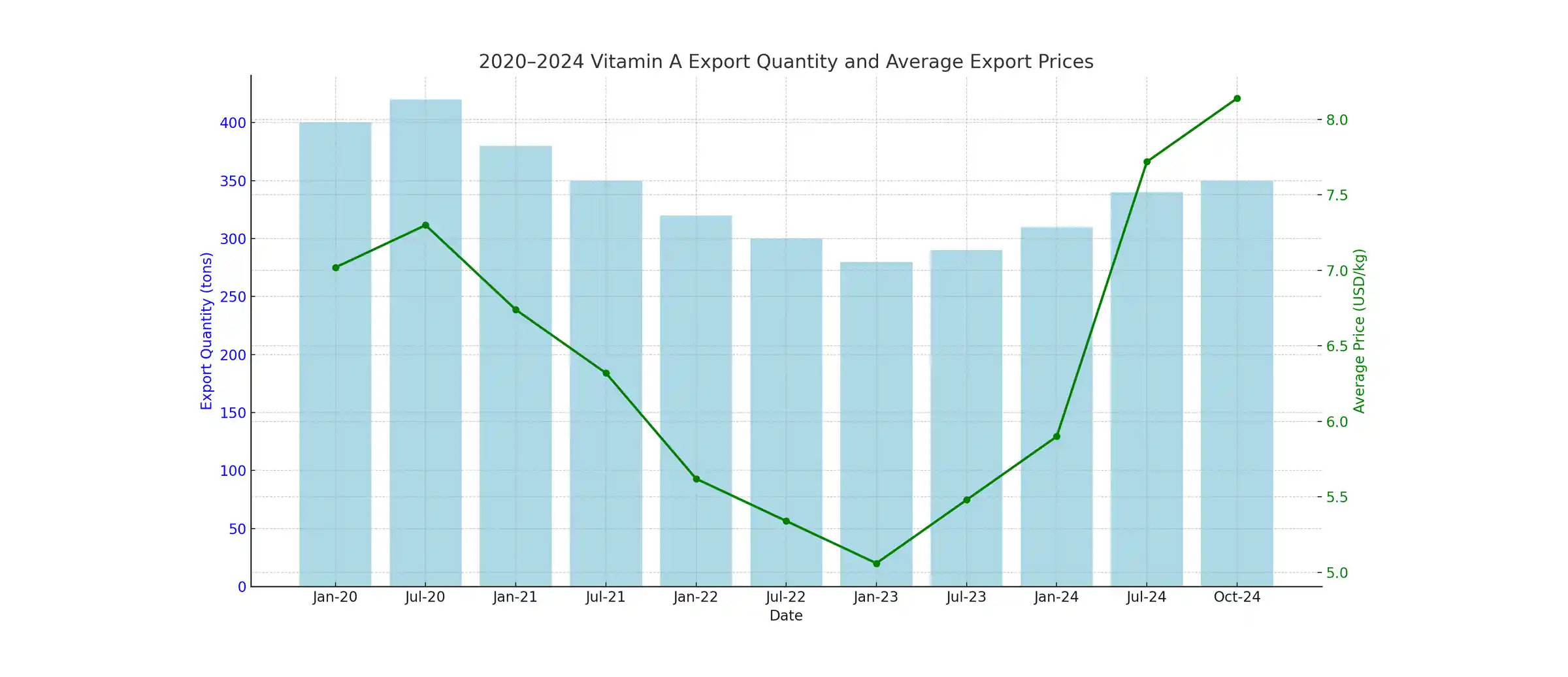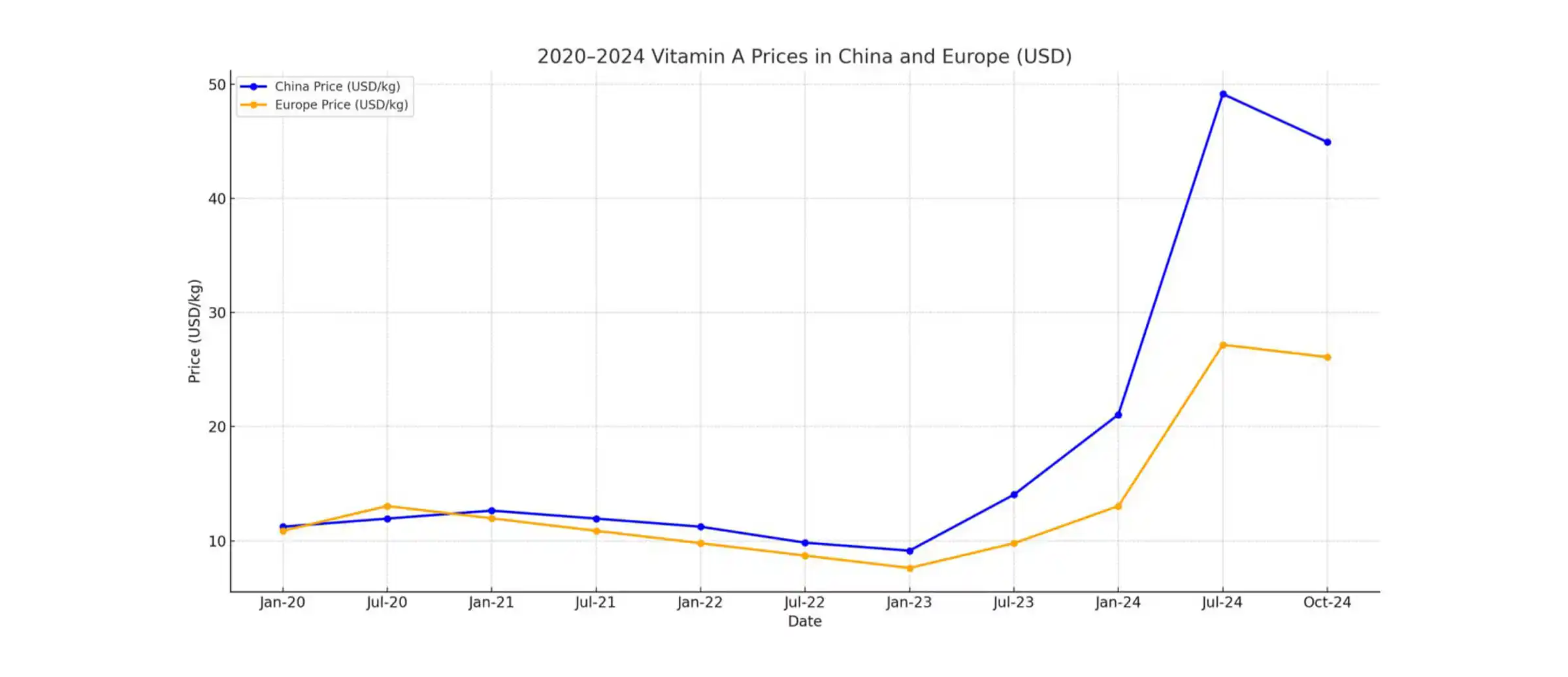قیمت ویتامین A1000 در ماه اکتبر در اروپا کاهش یافت و تا پایان ماه در بازه قیمتی ۵۷ تا ۶۶ یورو در هر کیلوگرم رسید؛ که نشان از کاهش ۳ تا ۸ یورویی به ازای هر کیلوگرم نسبت به پایان ماه قبل(سپتامبر) دارد. همانطور که گفته شد در ۱۷ اکتبر شرکت BASF اعلام نمود که انتظار میرود از سرگیری تولید ویتامین A تا ماه آپریل ۲۰۲۵ بطول بیانجامد که این امر سبب دیدگاه محتاطانه در بازار ویتامین A گردید.