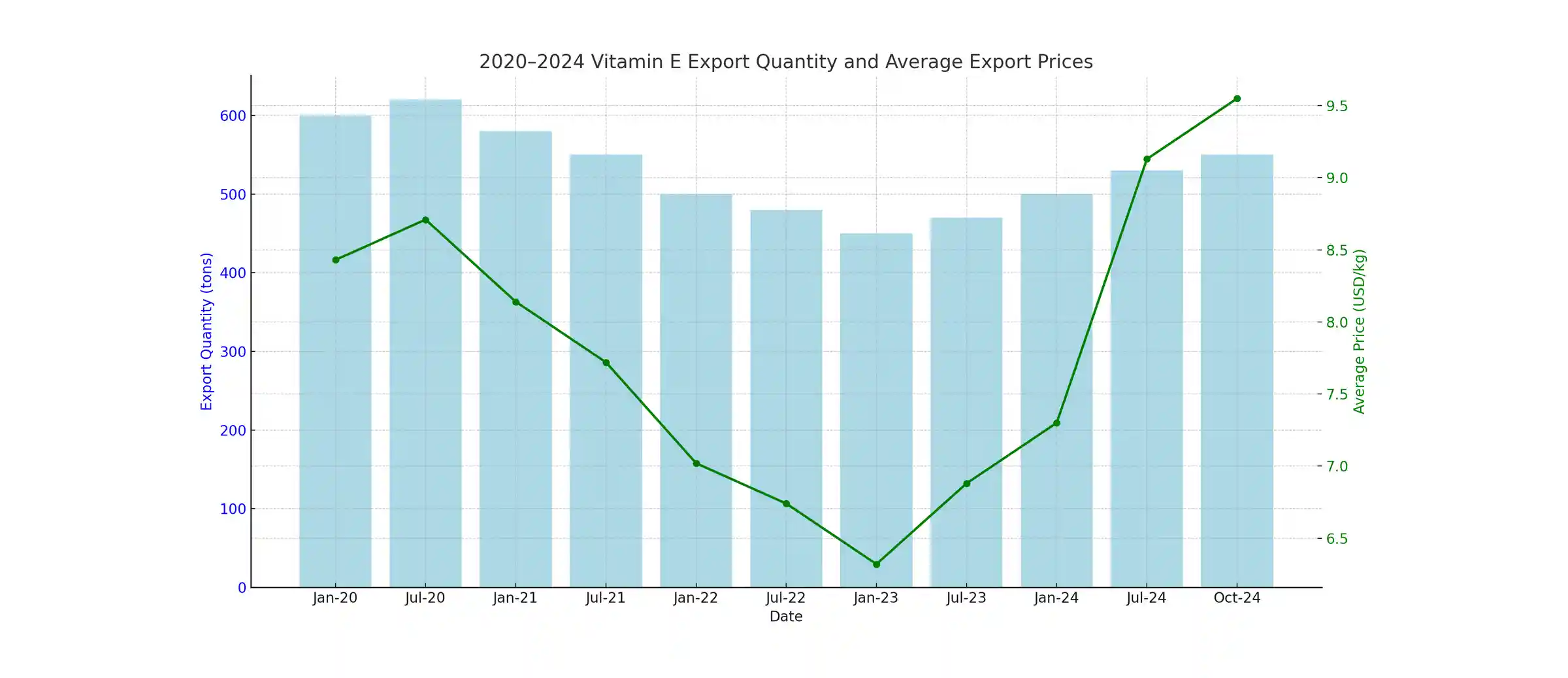 نمودار صادرات ویتامین سی و قیمت میانگین آن از چین در فواصل سالهای ۲۰۲۰ تا ۲۰۲۴