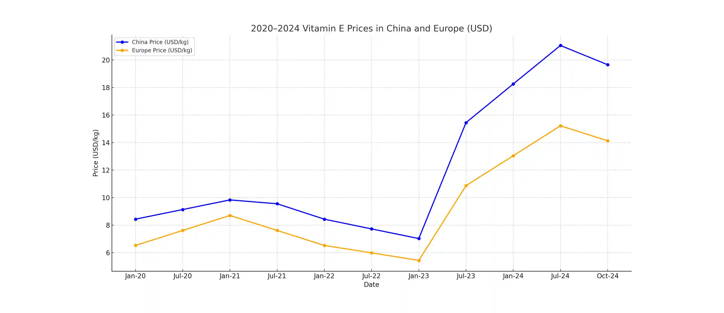 نمودار قیمت ویتامین E50 در چین و اروپا در فواصل سالهای ۲۰۲۰ تا ۲۰۲۴